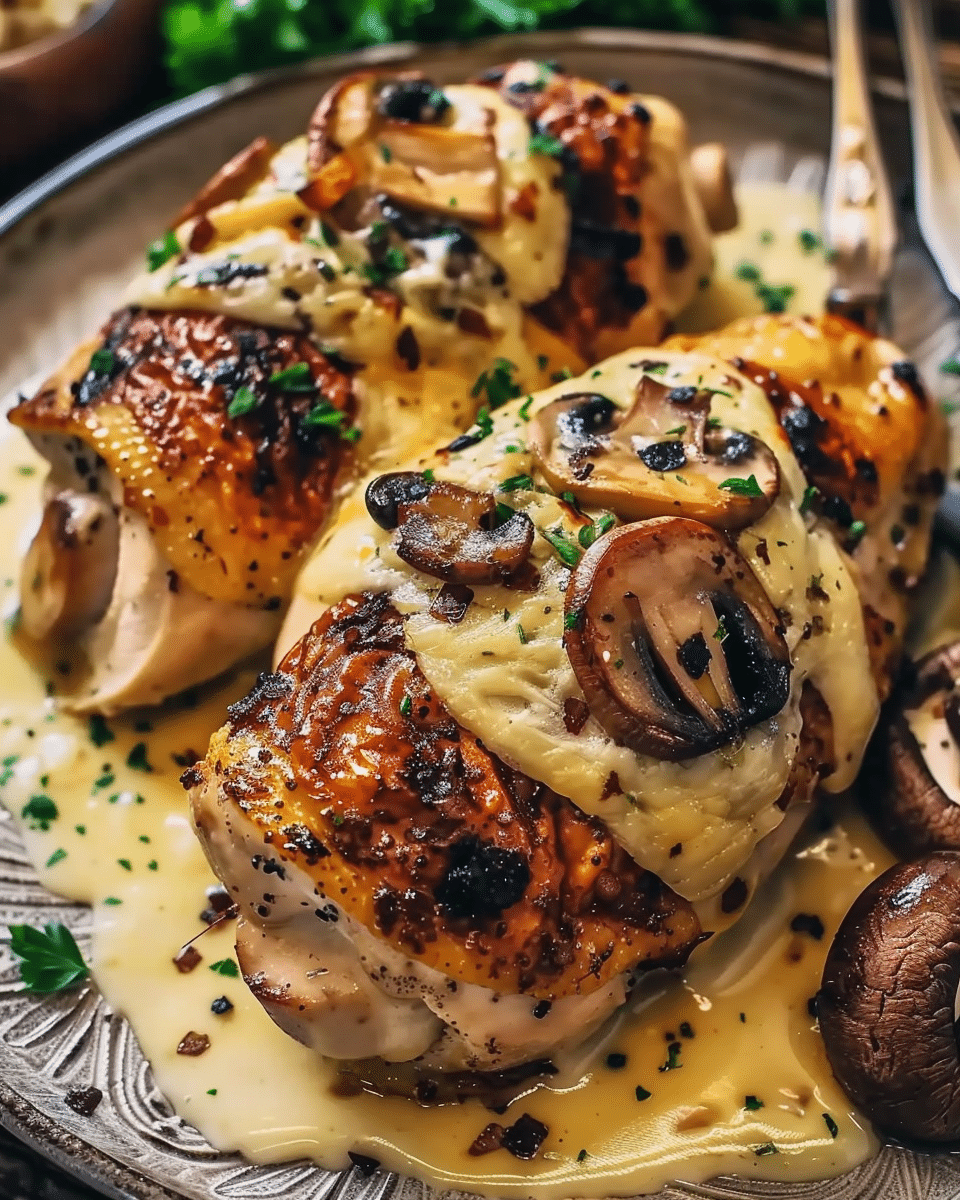 Cheesy Garlic Butter Mushroom Stuffed Chicken