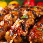 This BBQ chicken recipe features juicy marinated chicken breast pieces grilled with colorful peppers and onions on skewers. The sweet and smoky BBQ flavor makes it perfect for summer cookouts or easy weeknight dinners.